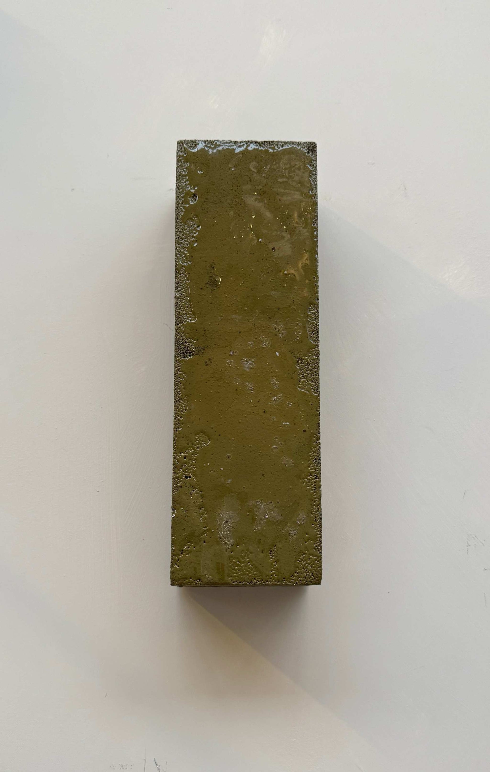 A sculptural object created from leftover packaging material, transformed through color and wax. What was once a temporary, overlooked fragment becomes a solid shape with presence — a quiet object on the wall.